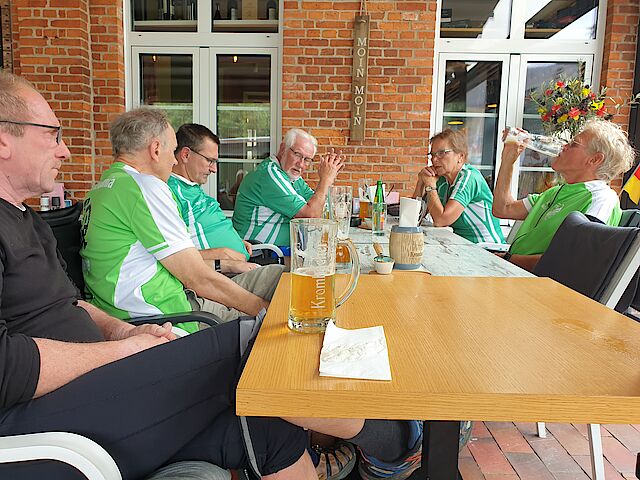 Die Erholung fand beim Italiener statt, wo man sich mit unendlicher Geduld dem Ausgleich des Flüssigkeitsverlustes hingab und der Abend ausklang. Nach einem ausgiebigen Frühstück ging es am Sonntag per Zweirad durch die schöne Wald- und Heidelandschaft zurück nach Uelzen.