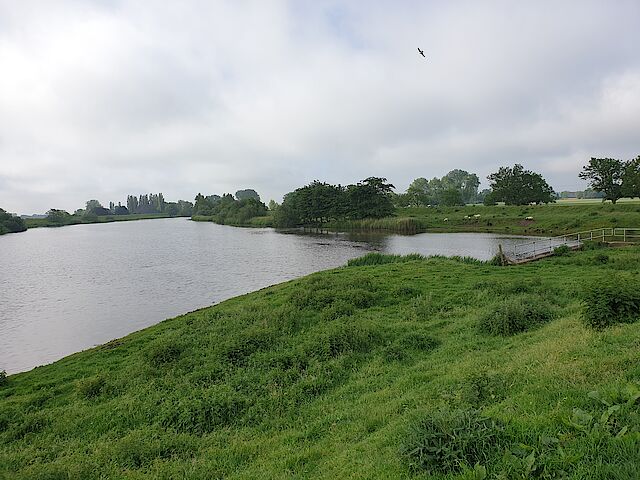 Glückstadt wird gestreift. Das wohl schönste Teilstück der Tour ist die Fahrt am Ufer der Stör, die uns lange begleiten wird. Der Radweg ist geschottert, aber trotzdem gut zu befahren.